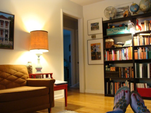 The lampshades are vintage and I recovered them in burlap. It was my attempt at being crafty. But when I flick the switch they illuminate this awful, orange glow reminiscent of a dorm room circa 1978 with Tammy Wynette singing softly in the background while someone sprays their giant bangs with Aquanet and makes plans to meet their boyfriend at the local pool hall. Obviously at a southern university.
