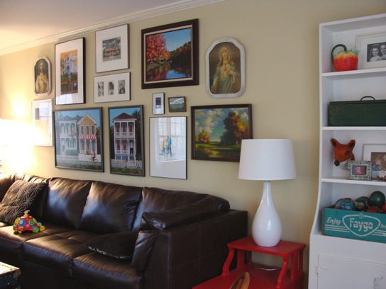I also took the plunge and hung a gallery wall. It happened in about fifteen minutes, on the fly. Things could have been much worse, but I’m sure I’ll tweak it later. The window panels are flat sheets.They are my new favorite window treatment. Ahh…white walls, white curtains. Just in time for spring. Maybe. You know. If we can stop watching Chopped on our DVR and get off our duffs to actually paint.