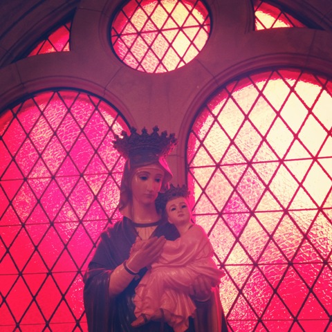 I sat on a bench in the back, just so happy to be there, so thankful to have time to myself. I pondered how much easier it might be on Sunday mornings to get into the right frame of mind if we Protestants worshipped in such a beautiful place. It was silent, and the candles flickered, and the pink light shone through the stained glass, and I was happy. Very happy.