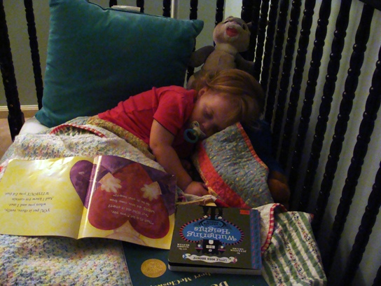 She’s so big all of a sudden. I turn on her twinkle lights at night, and she crawls in bed with her books. We let her read for another hour, and when I go in to turn out the lights I usually find her like this, asleep mid-book with her pacifier. She only uses pacifiers at night now. In the morning she wakes up and says, “Pacy only for night night.” I know we should take it away permanently, but it seems to be the last vestiges of her babyhood. So for now, we let her keep it.