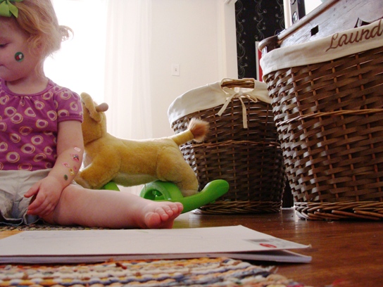 Jane is in love with stickers. For a while it was crayons, but now it’s stickers. She isn’t satisfied until she’s covered her face and arms with them, and then mine as well. Then 30 minutes later she pulls them off and says “ouch, you hurt me” to every sticker.